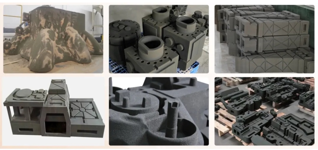 該設(shè)備可有效解決大尺寸砂型鑄造的效率和成本難題,為行業(yè)提供了全新的解決方案。傳統(tǒng)工藝在制作大尺寸鑄件時,通常需要拆分鑄造再焊接,增加了設(shè)計成本和時間成本,還容易產(chǎn)生焊接缺陷。3DPTEK-J4000采用無砂箱柔性區(qū)域成型技術(shù),支持局部打印,最大可成型4米的砂型,可完成大尺寸、復(fù)雜結(jié)構(gòu)件的一體鑄造,極大地提高生產(chǎn)效率和鑄件質(zhì)量,滿足大尺寸、高精度砂型鑄件的應(yīng)用需求。